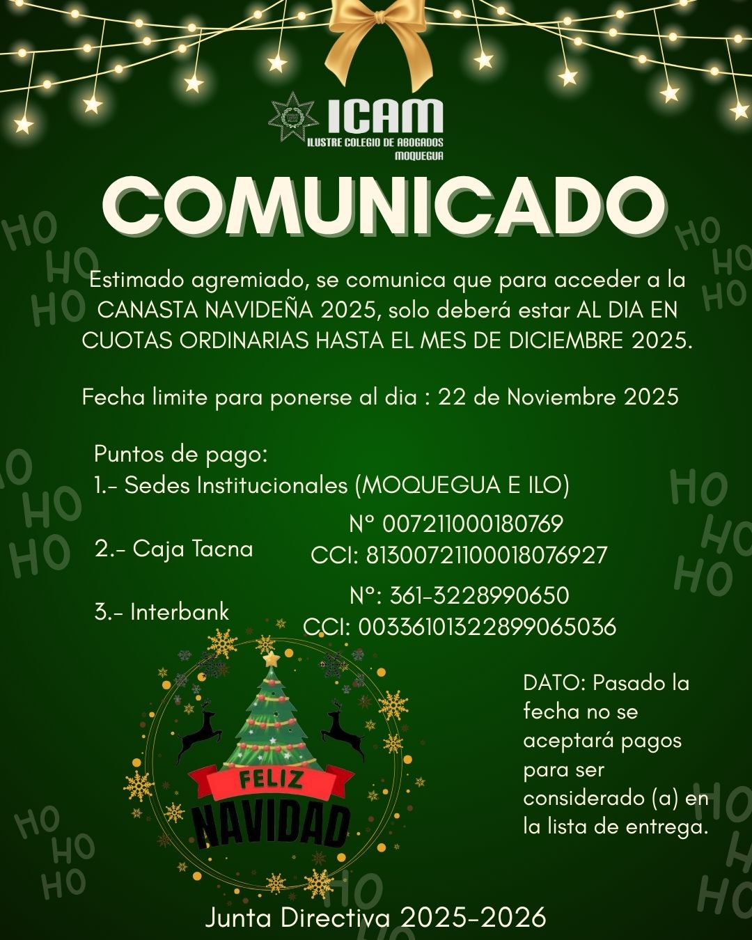 NOTA: SOLO SE ACEPTARÁN PAGOS HASTA EL SABADO 22 DE NOVIEMBRE, POSTERIOR A ESA FECHA NO SE PODRÁ CONSIDERAR EN LA LISTA DE ENTREGA.