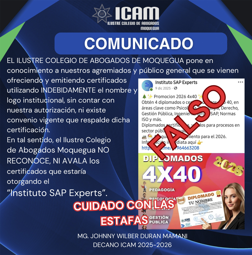 En tal sentido, el Ilustre Colegio de Abogados Moquegua NO RECONOCE, NI AVALA los certificados que estaría otorgando el Instituto SAP Experts.